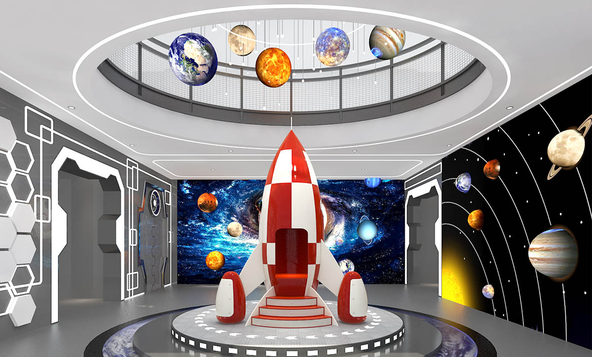 1 floor LobbyTechnology feel 10 enough , aviation days Theme through wear Lobby whole Design direction case ,Lobby in room fire arrow and Wall star ball not only only is Decoration, still can AndChildrenInteractive, in Interactive process in ChildrenThrough visual sense · listen sense · touch sense come study learn universe Knowledge。